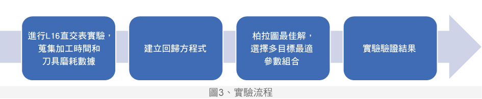 本實驗結合田口方法(Taguchi Methods)[1]-[3]、線性回歸 (Linear Regression)[6]-[8] 和柏拉圖最適 (Pareto Optimality)[9],推估多目標最佳參數組合。利用切削參數群和L16直交表進行實驗。將L16直交表實驗結果建立刀具磨耗和加工時間的線性回歸,透過柏拉圖最適獲得最佳組合解。