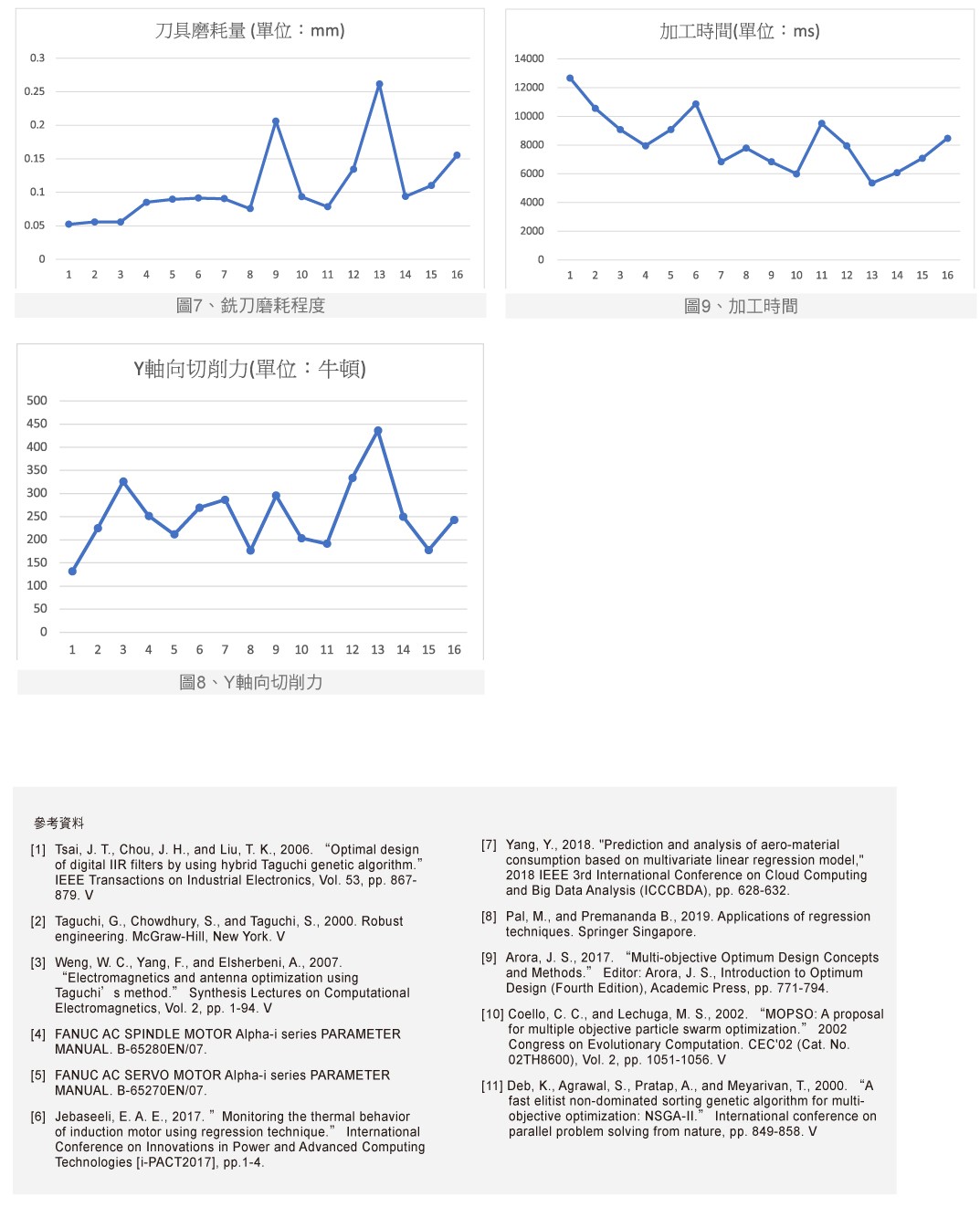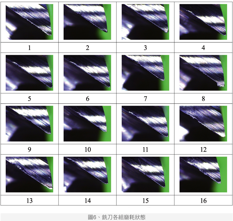 本文提出結合田口方法、線性回歸及多目標演算法來估測最佳參數組合,實驗結果,利用電子顯微鏡進行刀刃磨耗評估,如圖6所示。每組合平均磨耗皆有所不同,透過電子顯微鏡對每組刀刃進行磨耗量測 (定義參照ISO 8688-2:1989, Tool life testing inmilling),磨耗數據皆以平均值表示,磨耗程度如圖7所示,第13組切削參數組合其刀具磨耗量最大,而第1組切削參數組合最低。因圖6、銑刀各組磨耗狀態切削路徑為X軸向進刀,最大切削力發生在其正交軸上,因此觀察Y軸向切削力結果與刀具磨耗程度相符,如圖8所示,第13組切削參數,其Y軸向切削力最大,而第1組切削參數,Y軸向切削力最低。從圖9可以得知刀具磨耗與加工時間呈現反比。分析推薦最佳參數組合分別為切深1.5mm,切寬4.8mm,線速度60m/min和每刃進給量0.065mm,提供加工應用業者可同時兼顧刀具磨耗及加工時間,將獲利極大化。