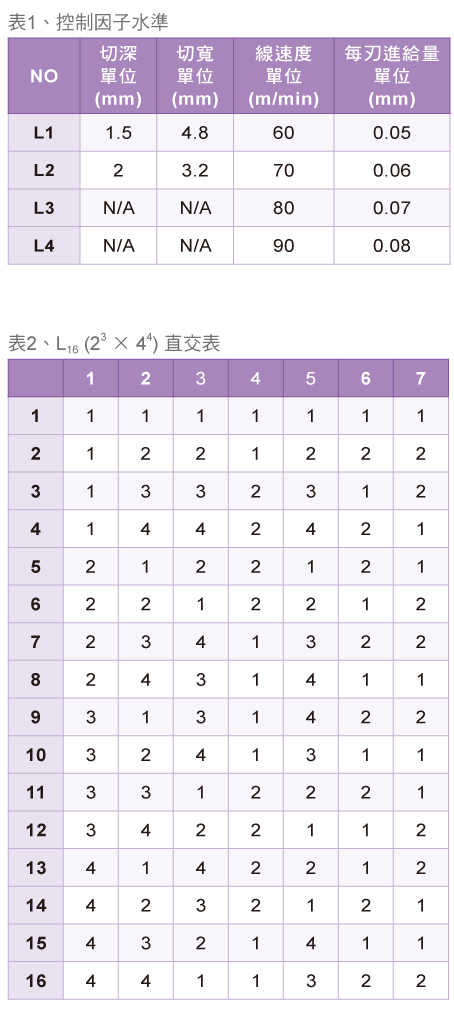 實驗刀具為直徑8mm之4刃未鍍層端銑刀,其控制因子水準設計如表1所示。主軸轉速及工作臺進給速度計算公式請參考公式 (1)和 (2)。