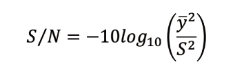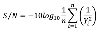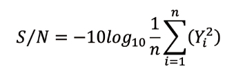 信號雜訊比依據不同品質特性來區分,包含望大、望小及望目特性,本研究將刀具磨耗和加工時間特性視為望小特性,不同信號雜訊比分別依以下公式計算: