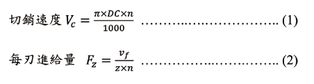 其中,VC是切削速度(m/min)、FZ為每刃進給量(mm/tooth)、DC則是铣刀直徑(mm)、n表示的是主軸轉速(min-1)、z為刃數以及vf 為工作臺進給速度(mm/min)。