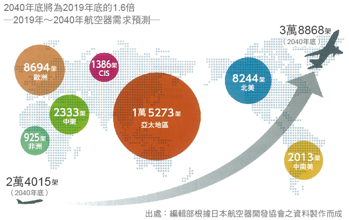 除了短期回復外,中長期成長也值得期待。根據日本航空器開發協會所提供的資料,2040年底時全球飛航中的飛機數將達3萬8868架,較2019年底的2萬4015架成長1.6倍(見前頁上方),其中包括新增需求1萬4853架,現有飛機的替代需求1萬8641架,既有數量5374架。