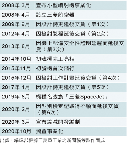 航空公司因疫情被迫重新評估新機採購計畫,航空器製造商及供應商也面臨困境,2020年有多家航空器製造商及引擎製造商決定減產。日本的三菱重工業也在同年10月底宣布擱置小型噴射客機「三菱SpaceJet(MSJ)」的事業化。量產初號機的交貨已因設計變更及工作計畫檢討等理由6度延期,在美國聯邦航空總署型別檢定證的取得上也遭遇困難。再加上疫情影響,該公司於是決定擱置事業化。MSJ的開發大事記請見左下方表格。