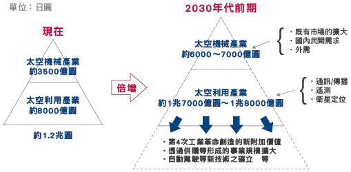 除了航空器產業,太空產業今後同樣成長可期。根據美國的摩根史坦利等機構的推估,太空產業的市場規模在2040年將成長至120兆日圓,約為目前的3倍。