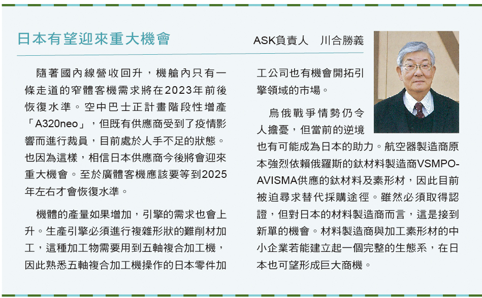 但當航空業克服了疫情難關,正要再度起飛之際,又遭逢了俄羅斯入侵烏克蘭的戰事爆發。俄羅斯擁有全世界最大的鈦材料製造商「VSMPO-AVISMA」,許多航空器製造商原本都是向該公司採購鈦材料及素形材,目前正四處尋求替代採購途徑,供應鏈混亂的狀況似乎將持續下去。