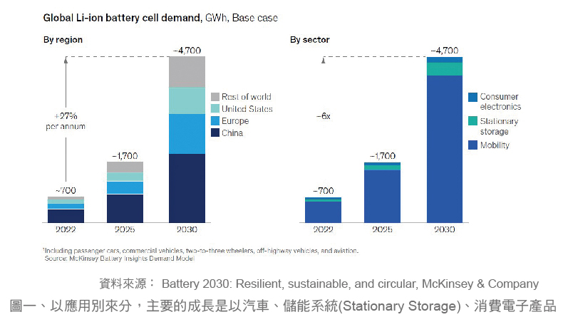 若以地區別來分,主要成長區域依次為中國、歐洲與美國。因為中國已經有相當成 熟的鋰電池供應鏈,占著極大優勢,預估到 2025年,中國將佔有鋰電池市場的45%;到 2030年,中國仍將佔有鋰電池市場40%的份 額,歐美的急起直追,將有最大的成長率。 以應用別來分,主要的成長是以汽車、儲能 系統(Stationary Storage)、消費電子產品, 詳如圖一。鋰電池市場主要推動力是通過更 廣泛的能源轉型與電動交通工具,來減少氣 候變化的迫切壓力。