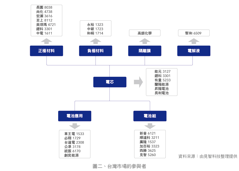 全球鋰電池市場一片叫好聲,回過頭來, 台灣的廠商、供應鏈能否在這一波獲得發展 呢?台灣的鋰電池供應鏈,大致分為上、 中、下游。上游是原材料,包含:正極材 料、負極材料、隔離膜與電解液;中游則是 以電池芯、電池模組;下游則是電池組與電 池應用。台灣市場的參與者如圖二。
