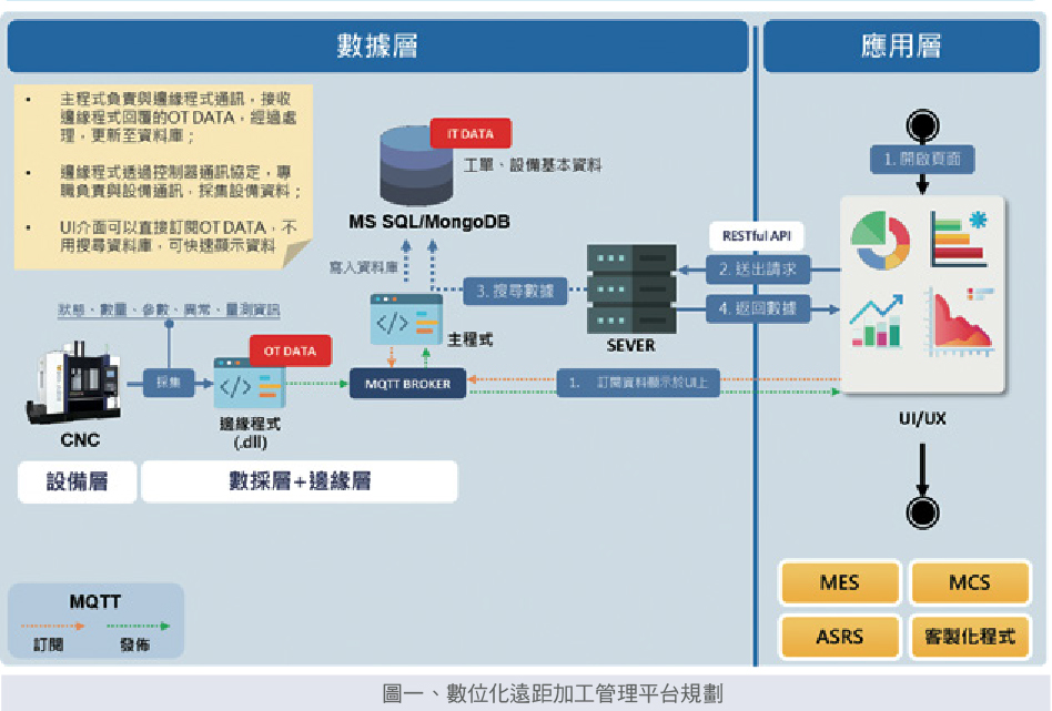 建立工具機通訊界面平台與客製化人機介面,數位化遠距加工管理平台系統可給予機台加工時間分析、閒置率、即時生產資料等製程資訊與功能,使機台可與各廠牌之控制器進行通訊,建立機台MES(製造執行系統)系統之基礎,技術規劃上,主程式負責與邊緣程式通訊,接收邊緣程式回覆的OTDATA(工業營運資料),經過處理,更新至資料庫,邊緣程式透過控制器通訊協定,專職負責與設備通訊,採集設備資料,且UI(人機操作介面)可以直接訂閱OTDATA,不用搜尋資料庫,可快速顯示資料(參考文獻[1]、[2]、[3])。