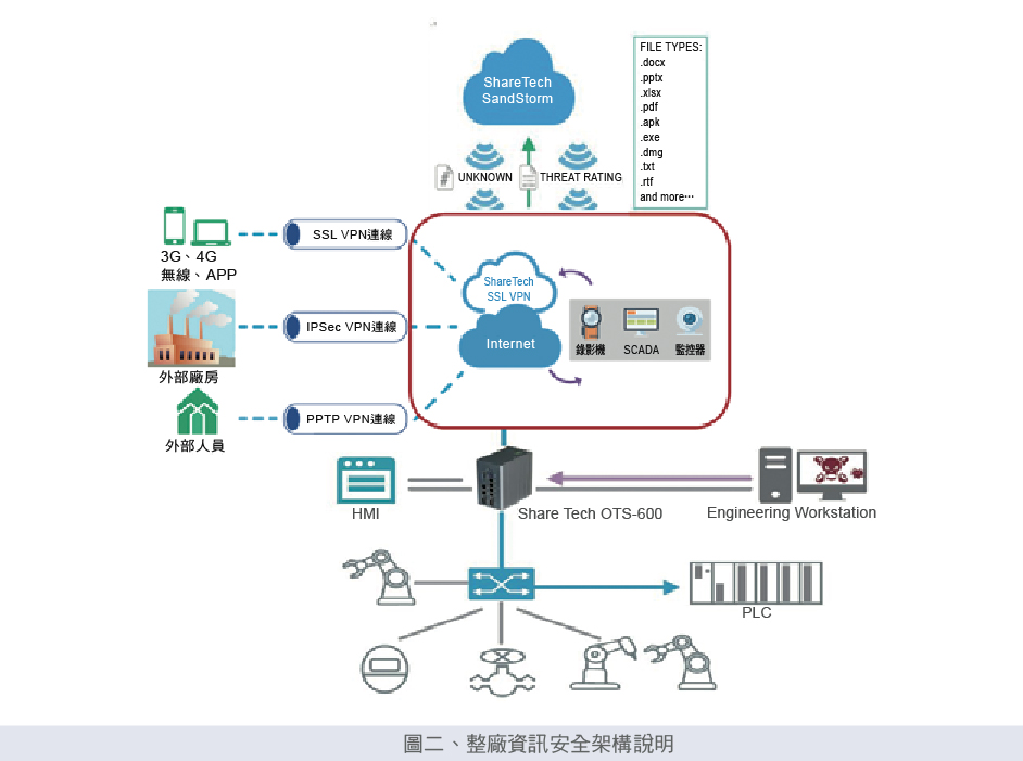 之後在此系統上,整合IT/OT(資訊/工業營運資料)資安應用需求,安全互聯網管理服務中,建置零信任資安防護架構,針對外部訊息有VPN(虛擬私人網路)遠端安全訪問控管,針廠內OT部分有白名單管制,最後對OT設備要有基本的防火牆與流量監控,完成資安建構工作(如圖二),智慧製造雲端服務才能有效的佈建於企業國內總部及海外工廠(參考文獻[4]、[5]、[6])。