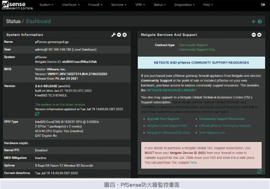 使用網路流量監控工具、開源軟體進行部署,進行部署場域之流量分析,入侵檢測,與防火牆建置。安裝部署防火牆,可以並提供弱點掃描結果相對應之防火牆修補規則,以有效修補掃瞄出之弱點,最後安裝部署入侵檢測系統(IDS),可以監控網路傳輸,檢查是否有可疑活動或者攻擊封包,以即時監控並發現攻擊,加強防護。常見的防火牆面向監控執行內容包含安裝防火牆至指定設備、提供實體防火牆設備供安裝於所需防護的網段、提供防火牆使用之教學文件及教育訓練、提供特定弱點之相對應防火牆修補規則。常見的入侵檢測系統(IDS)面向監控執行內容包含安裝IDS至指定設備、提供實體IDS設備供安裝於所需防護之網段、即時監測網路封包告警之功能與分析網路封包之功能,搭配PfSense防火牆,可對網路流量進行基本過濾與阻擋,並即時監控畫面。
