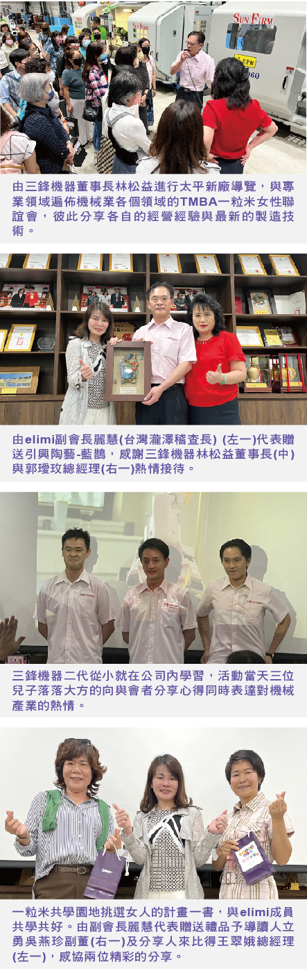 TMBA elimi 一粒米女性經理人聯誼會( 以下簡稱elimi ) 於8/19(五) 舉辦秋聚活動, 活動一大焦點為參訪三鋒機器工業股份有限公司太平新廠, 由林松益董事長偕郭璦 玫總經理及三位優秀的二代熱情接待, 以「三鋒機器的轉型之路」為題, 不藏私地 與e l imi分享三鋒機器頗有心得的數位轉型與淨零碳排技術, 並特邀工研院智慧製造 技術組羅佐良組長說明「工研院智慧機械雲」, 提供業者數位轉型務實方案。三鋒 機器與來自各個不同機械專業領域的e l imi成員, 在活動中一同激盪出製造技術與經 營管理的新思維。