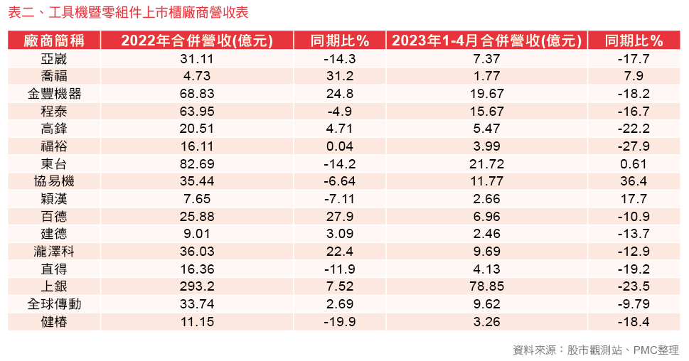 其他在2022年工具機廠商全年度營收超 過十億,卻受到區域衝突、地緣政治風險, 導致投資活動趨於保守,因此大幅負面影響 抑制了產業發展,導致營運表現不如預期。 走過一甲子風華歲月的協易機械(製造業排名 733名),營收小幅衰退6.51%到35.49億元, 囿於2022第四季至今年上半年外在大環境不 佳,預期今年上半年營運持平,在公司打入 日系汽車零件及美國家電業供應鏈體系,透 過不斷調整營運腳步及方向,建立符合市場 需求的沖壓技術應用與服務能量,期待下半 年營運好轉、協鴻工業(製造業排名892名), 營收小幅下滑3.31%到26.30億元。