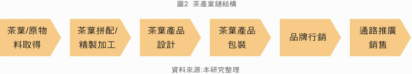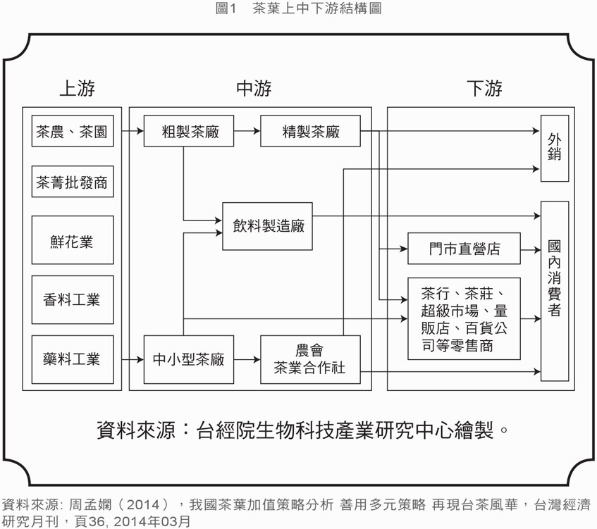 台灣茶產業整體環境的上下游結構分工明 顯,整個產業價值鏈的合作已經行之多年,茶 產業結構環境可區分為上、中、下游三部分的 分工業者(周孟嫻, 2014)。上游業者部分:主 要是茶園、茶農、茶菁批發商等,主要從事茶 樹品種培育、研究、種植和茶菁採摘等,屬於 技術導向的經濟活動;中游業者部分:以粗製 茶廠,和茶的烘焙精製的精製茶廠、茶包包裝 業者等,主要從事茶葉的精製、烘焙、拼配加 工、包裝等業務,其功能在於使上游的茶菁或 粗製茶經精製加工後得以保存和商品化;下游 業者部分:包含各式茶品牌直營門店、茶莊、 茶行、百貨零售、線上通路等,主要是負責茶 產品的末端銷售,將產品直接或出口賣給消費 者(請見圖1)。
