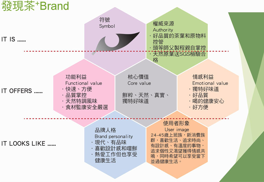 「發現茶」為線上茶葉「品牌電商」(B2C) 創業者,自己開發茶葉產品,從源頭自有產地 供應鏈、商品開發、行銷設計、通路業務全部 集於一身,期望以快速便利又真實味道的好味 道,成功圈住年輕人愛好。從30秒冷泡茶、有 機老薑烏龍到紅棗紅茶一路研發新品項,發現 茶行銷營運總監江舒韵發現,當自己掌握商品 技術力與調整空間時,跟市場溝通不但真實也 更有底氣7 。發現茶共同創辦人兼執行長陳翊 榮說發現茶想做的,是從產地到指尖的茶飲革 命,未來希望成為茶飲的供應鍊整合者,建立 在消費者心中最佳「真實自然好味道」的茶飲 品牌,因此團隊特別在三個地方著力:社群經 營、品牌意象、產地&供應鏈。且因自己曾是醫學系學生,就學時間看到許多因為現代食品 加工而受苦的病人,於是在他決定放棄從醫轉 換跑道創業時,選擇了「茶」作為他的創業項 目,希望能讓人除了品質堪慮的罐裝茶、手搖 茶,還有其他更健康天然的茶選擇,免於化工 食品造成的病痛之苦。
