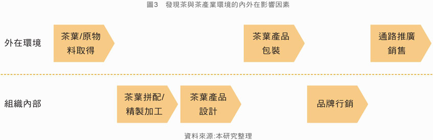 本研究在參照茶產業結構上中下游分析並結 合發現茶實際運作經營情形後,將茶產業的上 中下游分工,依據從上中下游(從生產到製造 到銷售端)的順序,另調整為從茶葉/原物料取得、茶葉拼配/精製加工、茶葉產品設計、茶 葉產品包裝、品牌行銷、通路推廣銷售六個階 段,從茶葉生產到製造到銷售,並以此六階段 檢視發現茶遇到的外在環境影響,以及發現茶 面對外在環境影響的策略管理因應之道。