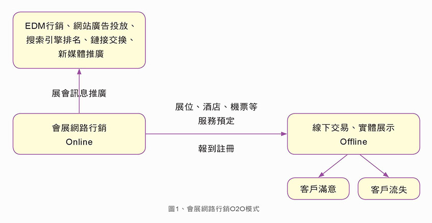 會 展 O2O 模式就是在以上幾種會展網 路行銷的基礎上產生的。O2O(Online To Offline),是指將線下的商務機會與線上的推 廣銷售相結合,讓互聯網網站成為線下交易的 前臺。目前會展O2O主要是通過展會資訊的 推廣、服務預訂等方式,把線下的消息推送給 互聯網用戶,將會展企業和消費者有機地聯繫 在一起,從而將他們轉換為自己的線下客戶。 目前這種模式最有成效的是被會展企業運用線 上上為參展商和觀眾提供各種預登記等服務。 (見圖1)