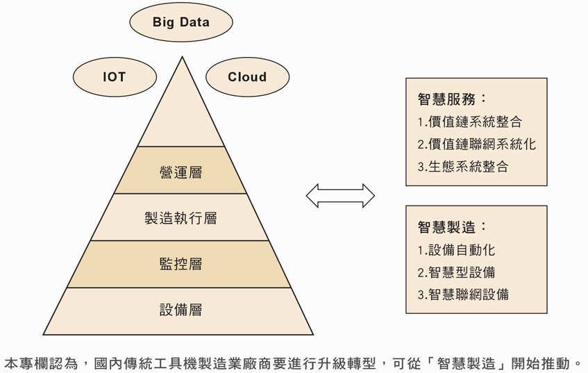 雖然全球市場競爭激烈,但在工業4.0的驅動之下,在未來,製造業廠商朝向智能工廠 角色扮演,將不再是遙不可及的夢想。對於傳統工具機製造業廠商來說,智能工廠實現的第一步,可以由內部資訊系統由上而下地進行建構。本專欄認為,智能工廠的實 現,必須協助現有製造業進行輔導升級(由工業3.0升級到工業4.0),並同時導入物 聯網、雲端計算、大數據等數位管理技術(商業4.0),如下圖所示,以有效促進國內傳統工具機製造廠商得以在海外獲取競爭優勢。