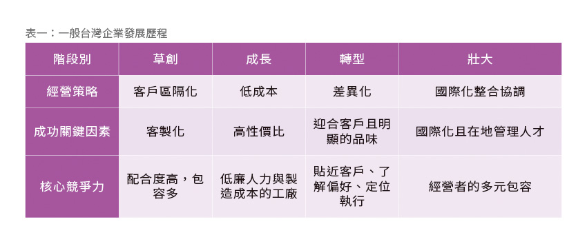 這兩家企業的成長歷程,如同近三十幾年大多數台灣企業發展一般,都是在因緣際會之下,有了一門技術或是遇到了一個市場機會而踏入了該產業。因創業初期生產與行銷能力都尚未成熟,無法與當時市場既有廠商競爭,只能在被主力廠商忽略的客戶中尋找商機。找到的客戶需求小、品項雜、客製化需求高。此時廠商也處於草創階段,規模小、彈性大、配合度高、包容多,兩者一拍即合,讓這些新公司開始發展。此時客戶區隔化成為經營策略,客製化是成功關鍵因素,配合度高、包容多則是廠商得以生存的核心能力。
