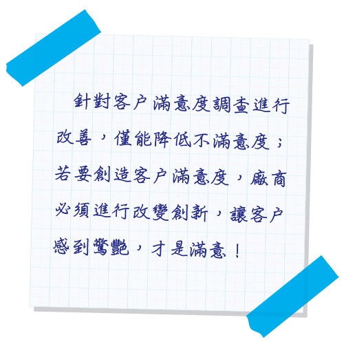 日前聽一位經營者抱怨說,全公司早已貫徹客戶至上理念,業務單位隨時搜集客戶滿意度資訊,也聘請專業行銷公司,將這些資訊融合客戶背景進行分析,以掌握客戶期望,轉化各項創新改善提案,落實於產品開發與公司營運上。做了這麼多,為什麼客戶還總是不夠滿意呢?我回答:「因為做了太多的客戶滿意調查,限制您的滿意度提升」。針對回應客戶需求的改善,只是解決當下的問題,在執行當下問題的創新改善同時,客戶又發現新的問題了,客戶就一直在不夠滿意狀態。