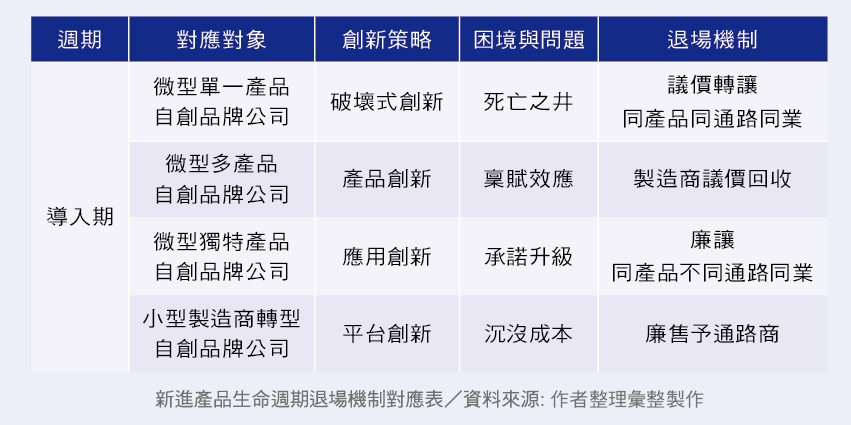 根據「新進產品生命週期」自創品牌經 營首要是按主力產品特性,依循所屬「破壞 式創新」、「產品創新」、「應用創新」、 「平台創新」等領導策略在產品進入市場 時,成功獲取喜愛創新事物的創新者與先 期使用者的青睞。產品在這個時期最需要展 現的關鍵要素是「創新」,而當成功進入市 場取得先機,在將這項「創新」轉換為「實 用」,也就是既創新也兼顧實用性,才可讓 成理性務實的早期大眾的買單。