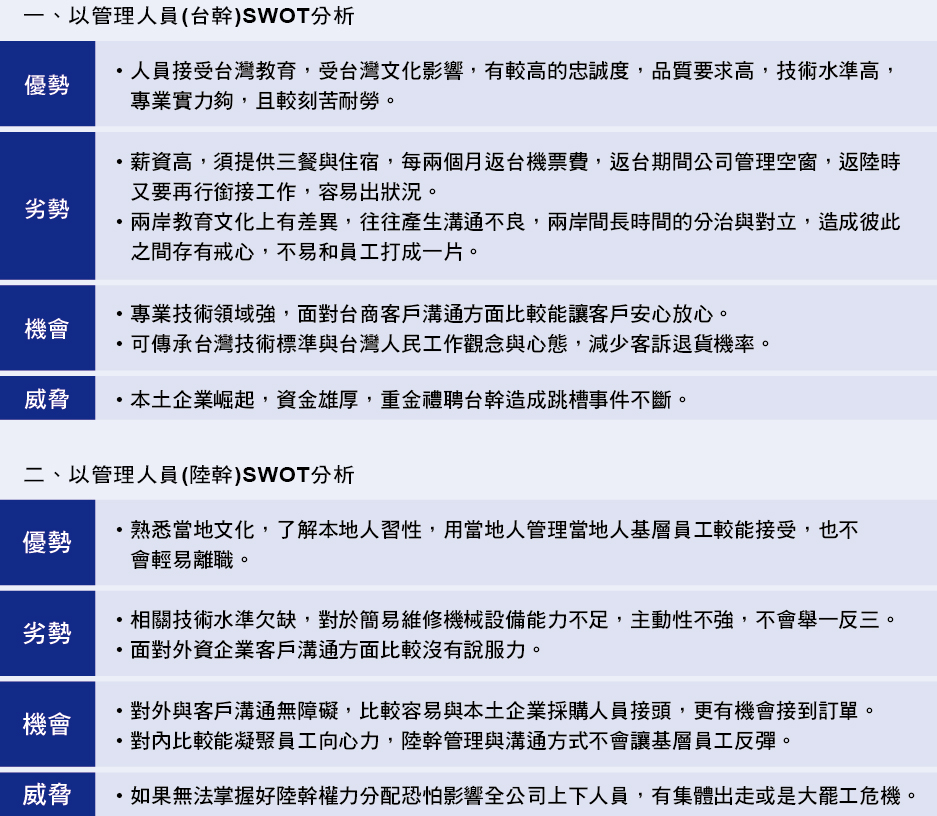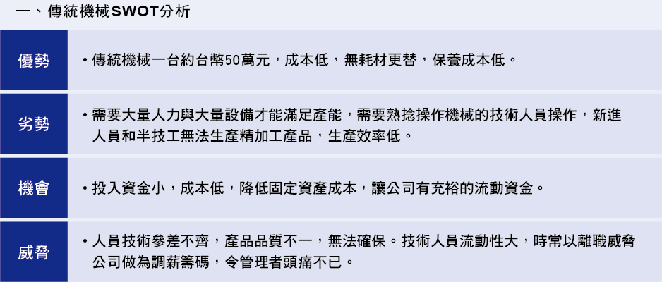 支撐海外中小型傳產企業發展最重要的2項因素不外乎是人力和機械設備,許多台資 企業進入中國已經超過20個年頭,面臨存亡關鍵時期。中國從最早先的工業1.0一舉 躍生至工業4.0的進程,後進的本土企業已經利用自動化生產模式造就規模經濟,許 多製程已經逐步被自動化甚至機器人所取代,不僅提高生產效率,也降低對人力的依 賴,造成台商嚴重損失。雖然尚未波及到本專欄所提的壓鑄機配件行業,但企業如不 未雨綢繆與時俱進跟上腳步的話將有可能被後進者取代,不得不謹慎面對。因此,利 用SWOT工具分析傳統機機械和CNC自動化機械的成本和效率和分析台幹管理人員與 陸幹管理員的優劣勢,有助於海外中小企業未來在中國長期營運找出可行辦法。