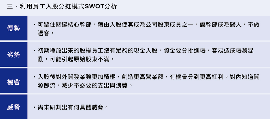 經由SWOT分析得知利用自動化生產為未 來企業的永續經營帶來的優勢與機會明顯大 於劣勢與威脅。操作者只須事先寫入參數(或 是調出先前的參數),進行工件安裝與卸除, 其餘生產過程均由CNC自動化機械自動完 成,不僅生產速度快,效率高,良率高,操 作者能輕鬆工作,減輕壓力。由於自動化生 產大量減輕了操作者的勞力負擔,員工上班 不累,自然就降低了人員流動率。企業還可 將人員配置精簡化,一名操作員可操作2台 CNC機械,不僅僅是精簡人力,降低人事成 本開支,也更便於人事管理,可謂之一舉兩 得之作法。