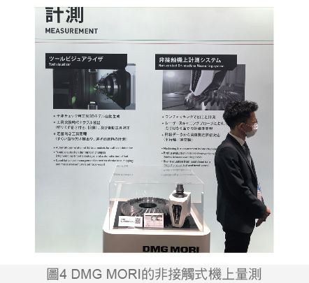 另一個案例則是在綜合加工機使用上, DMG MORI展示了以雷射感測為基礎的非接 觸式量測。在工件量測應用方面,面對齒輪 加工需要快速檢測齒型以及更細微的加工特 徵,採用探針式的量測方法有其極限,因此 以非接觸式方式替代,同樣可以整合至刀把 上更換至刀庫內。在刀庫內,建置了刀具檢測裝置,可以生成3D Model以更全面精準的 檢測是否有磨耗或破損等等,同時可以量化 磨耗量,進行刀具壽命的管理。