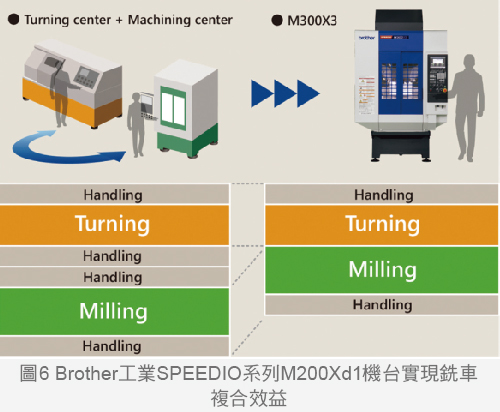 將原先需要各別單獨加工機台的製程整合 到一台工具機中完成,常見機台整合車削及 銑削兩種加工工藝。Brother 工業SPEEDIO 系列對加工方式作了改變,發表了M200Xd1機台,搭配新開發的CNC-D00多軸控制, 以及獨自開發的+120~-30度傾斜軸和DD直 驅迴轉軸,可收納達28支刀的ATC高速刀具 庫,並在主軸端配有兩面支撐車刀用固定夾 持機構提供安定車削加工能力,在同一機台 上完成車削、銑削、攻牙等多道製程,以高效 率及節省空間的車銑複合機種實現工程集約。