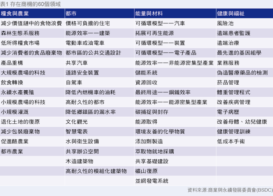 商業與永續發展委員會(BSDC)表示,於 『糧食與農業』、『都市』、『能源與材 料』、『健康與福祉』這4個領域,永續發展 將可能在2030年之前,創造12兆美元的經濟 價值,而且有60個領域存在商機。