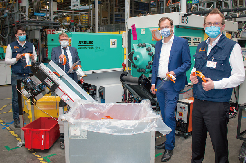 由於igus在歐洲自有龐大數量射出機、塑膠模具規模的工廠,所以在疫情期間回收該公司iglidur A200材料之後,已利用自家3D列印、塑膠射出成型技術,高效加速批量生產所有供醫療用防護面罩使用的橘色支撐框架、頭帶。在得知科隆地區即將重新開放學校的家長和老師們,都在擔心面罩不足的問題之後,igus現也正積極生產,提供當地所有在校學生超過140,000個面罩,期望藉此帶動社會重新振作的能量。